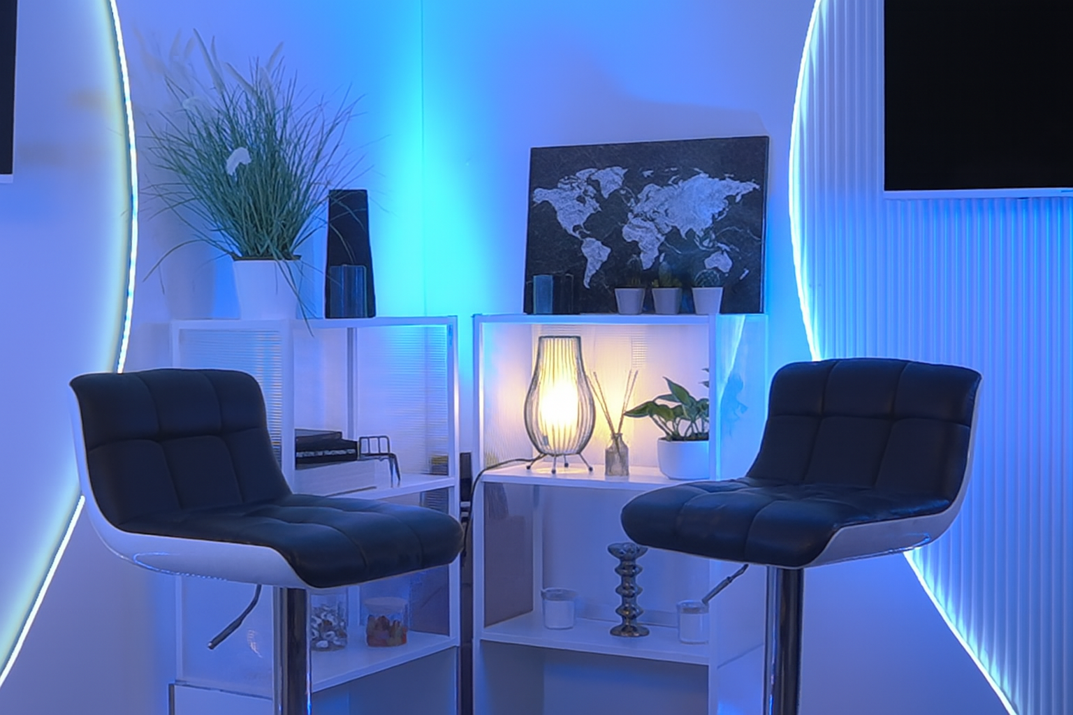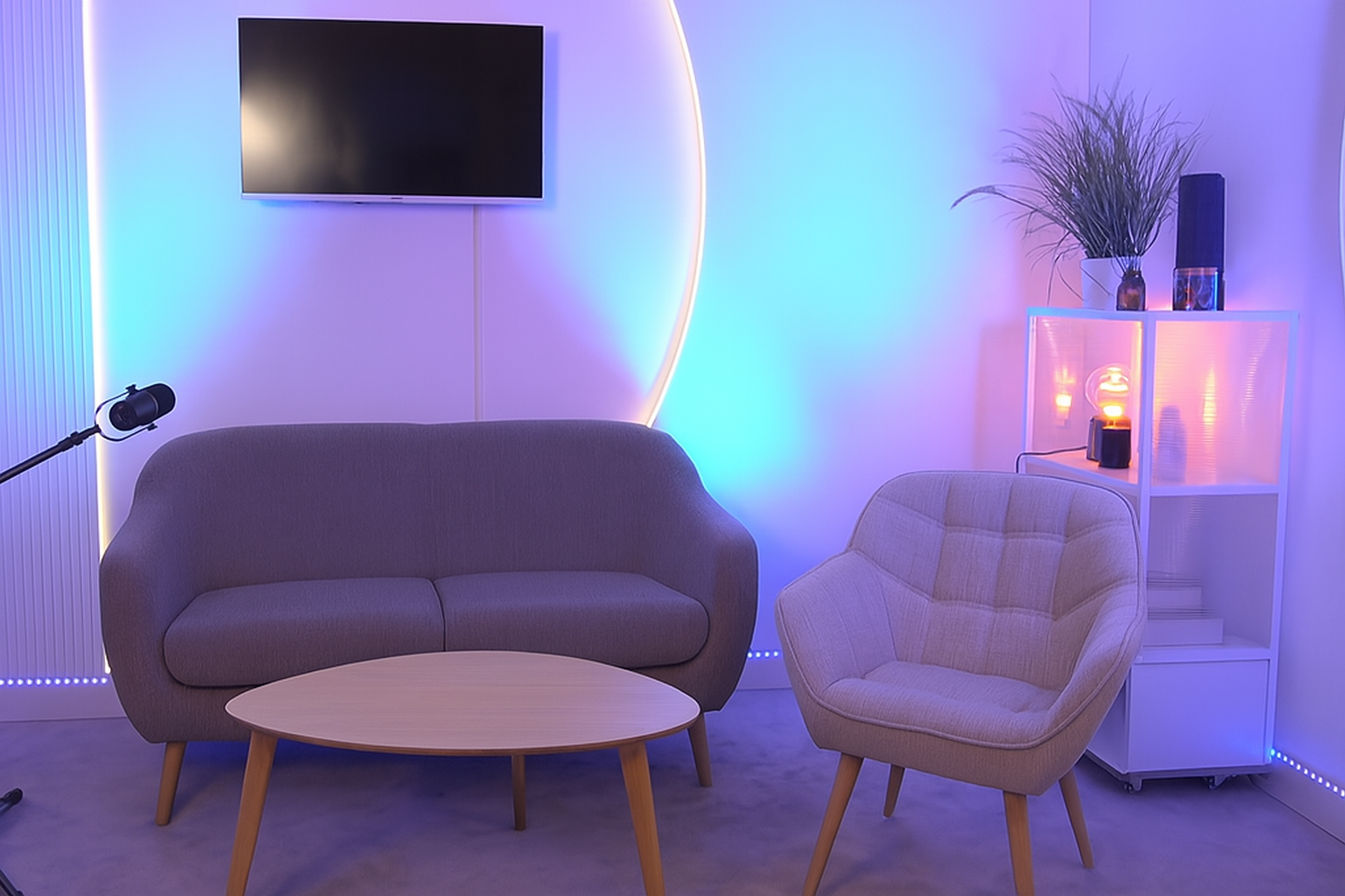 Studio équipé de caméras Sony 4K, micros SHURE MV7, éclairage LED professionnel et régie complète.